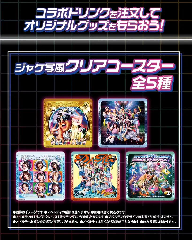 コラボドリンクはDJ KOO、BEYOOOOONDS、楽曲「最KOO DE DANCE」をモチーフにした全3種類が用意されます。1品注文につき、ジャケット写真風のクリアコースター(全5種)をランダムで1枚プレゼントするノベルティ付きです。