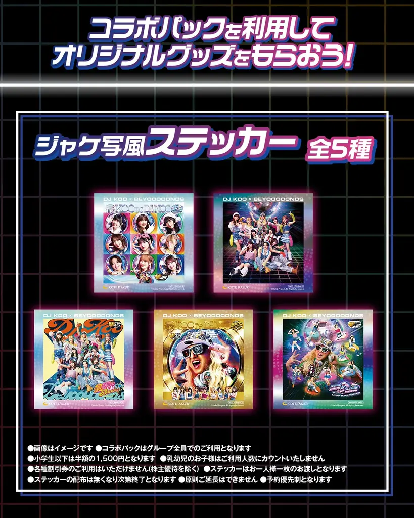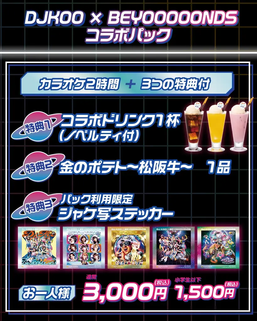 コラボパックはカラオケ2時間利用に加え、コラボドリンク(ノベルティ付)1杯と、番組でBEYOOOOONDSメンバーが食レポを行った「金のポテト第3弾『松阪牛』」がセットになっています。さらにパック限定の「ジャケ写風ステッカー」1種(全5種)が付属します。