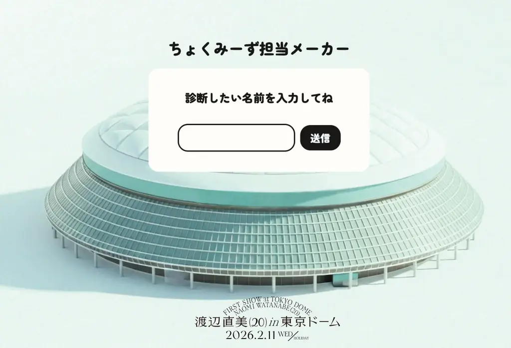 ドーム公演にあわせ、ファン参加型の無料WEBコンテンツ「ちょくみーず担当メーカー」が始動します。ファンネームである「ちょくみーず」向けのコンテンツで、ユーザーは氏名やニックネームを入力するだけで、公演当日に自分が担う“オリジナルの担当”をAIが診断します。診断結果はランダムに生成され、公演当日の観覧や交流におけるユニークな役割を示します。