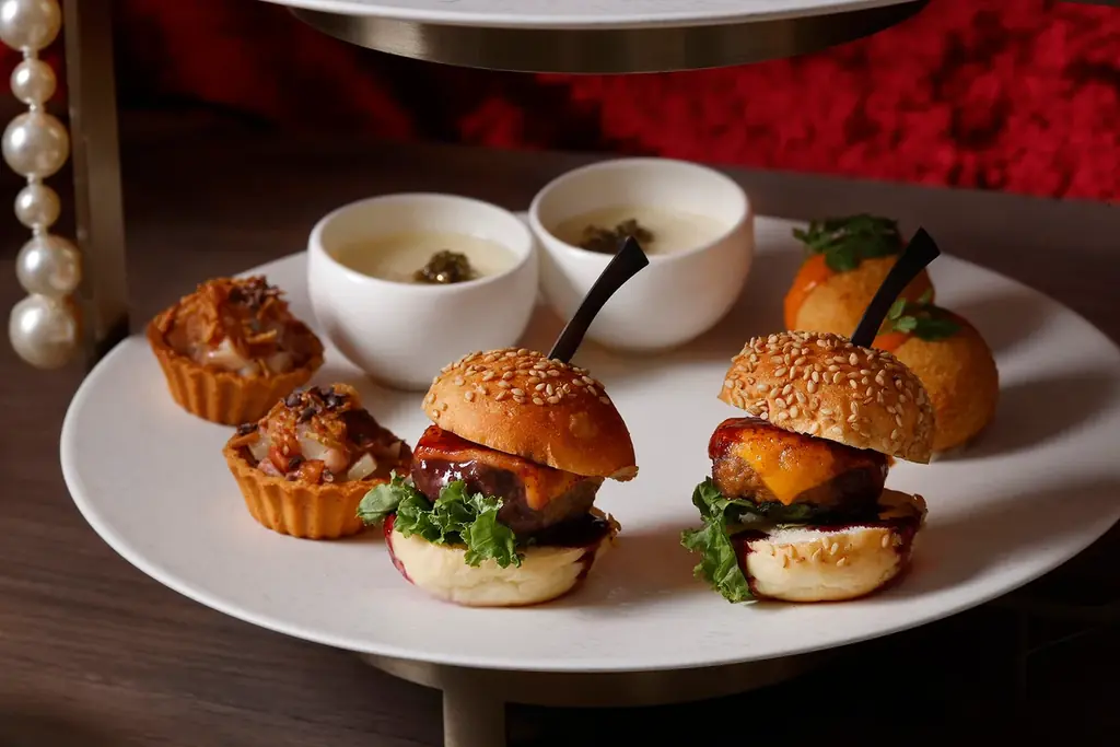 主なセイボリー(4種) ホワイトチョコとカリフラワーのムース(キャビア添え)、アランチーニ(オマール海老のクリームソース)、燻製鴨と洋梨のタルトレット(マスカルポーネクリーム)、TAVERN特製ミニバーガー(カシスと味噌のグレイビーソース)
