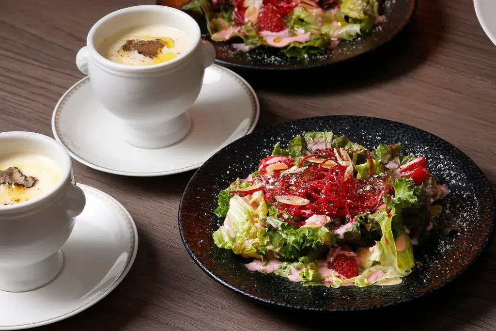 サラダ・スープ ラズベリーとビーツのジュエリーサラダ(ビーツシーザードレッシング)、じゃがいもとセロリラブのポタージュ(トリュフの香り)