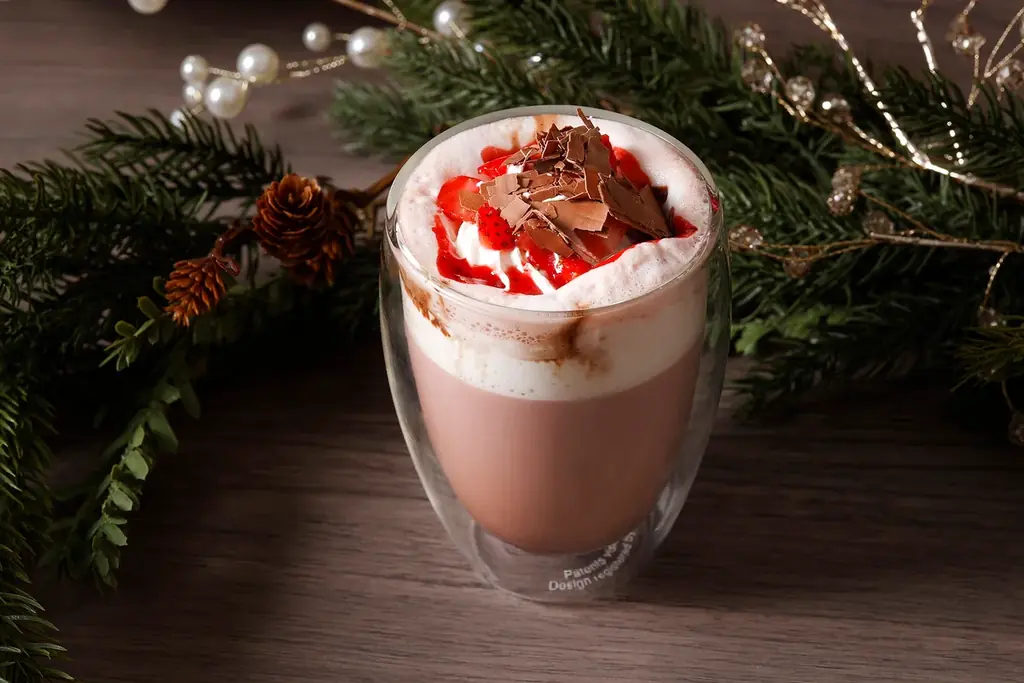 オプションとしては、冬に合う濃厚なホットチョコレートにいちごやミルクチョコレートのコポーをトッピングしたストロベリーホットチョコレートが提供されます(有料)。
