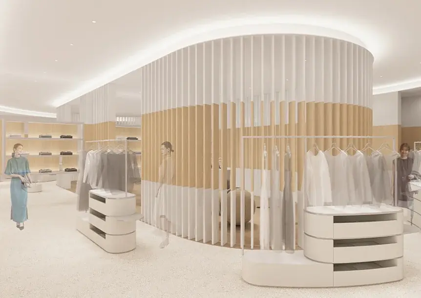 3FはReFa VITALWEARの第1号直営店舗に位置づけられ、温かみのある杢素材や曲線的な什器で温もりを表現したフロアです。ルームウェアやインナーウェア、スリープウェアまで着心地を重視したラインを揃えます。