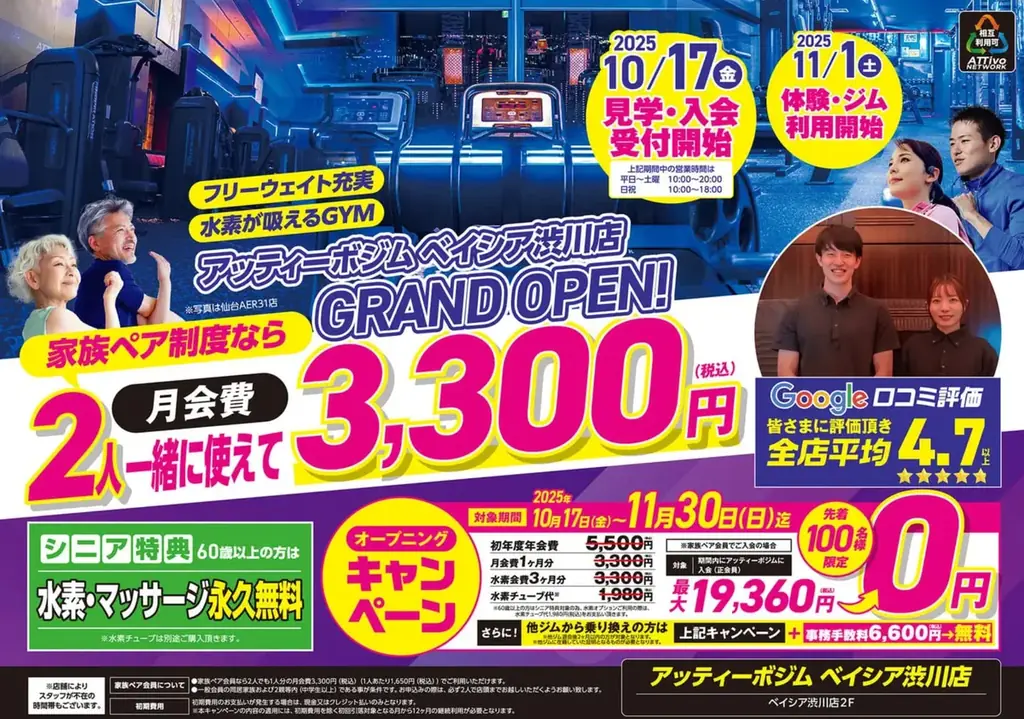 | オープニングキャンペーン | 期間:2025年10月17日〜11月30日。先着100名限定で初年度年会費5,500円、月会費1カ月分3,300円、水素会費3ヶ月分3,300円、水素チューブ代1,980円などを無料。他ジムから乗り換えで事務手数料6,600円が無料。 |