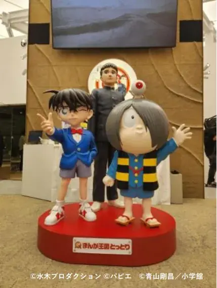 オープニングは10月14日に実施され、名探偵コナンやゲゲゲの鬼太郎のキャラクターが参加してテープカットを行いました。会場内では、来場者が記念撮影できるキャラクター展示、鳥取県産の梨や柿などの物産販売、万博会場で人気を集めたまんが関連グッズの販売が行われています。