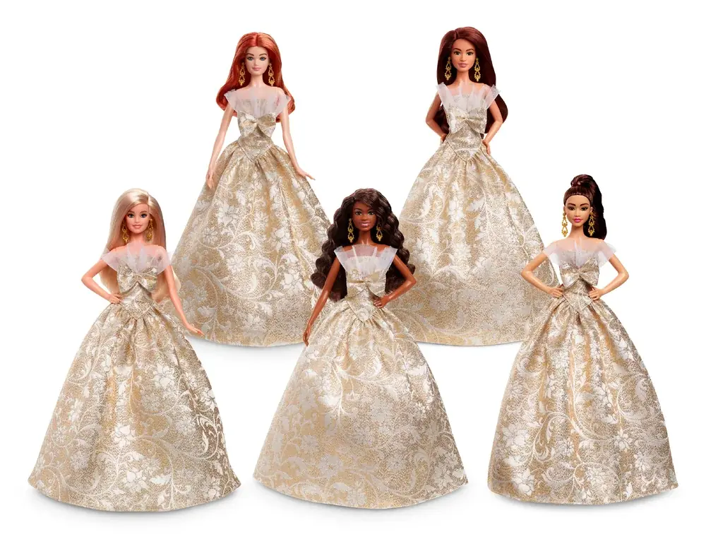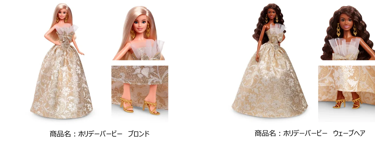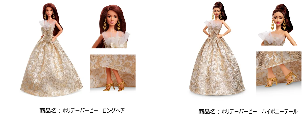 ホリデーバービーは1988年以来毎年リリースされている人気シリーズで、今年は異なるヘアスタイルと個性を持つ5体がラインナップされる。いずれもゴールドとシルバーを基調とした煌びやかなフルレングスのドレスを着用し、金糸・銀糸を織り込んだ繊細な模様が光の角度で表情を変える仕様となっている。