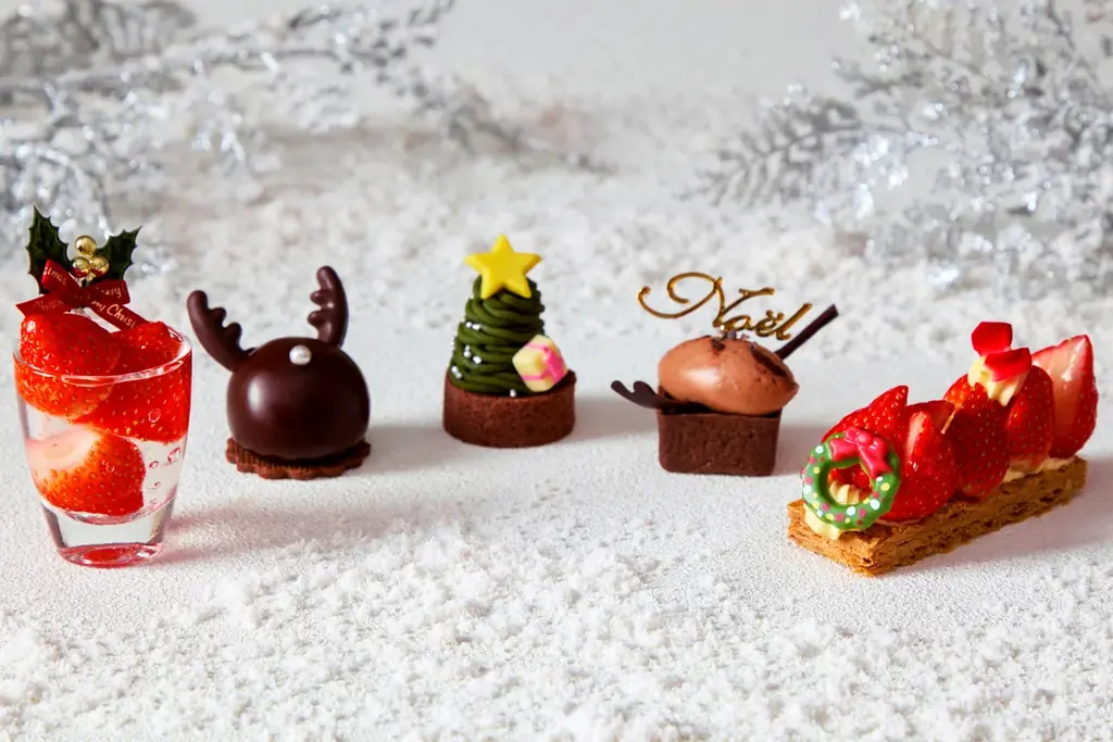 - 上段:いちごのマカロン / チョコレートムース / チョコレートモンブラン(クリスマスver.はツリーモンブランに変更) / いちごグラスジュレ