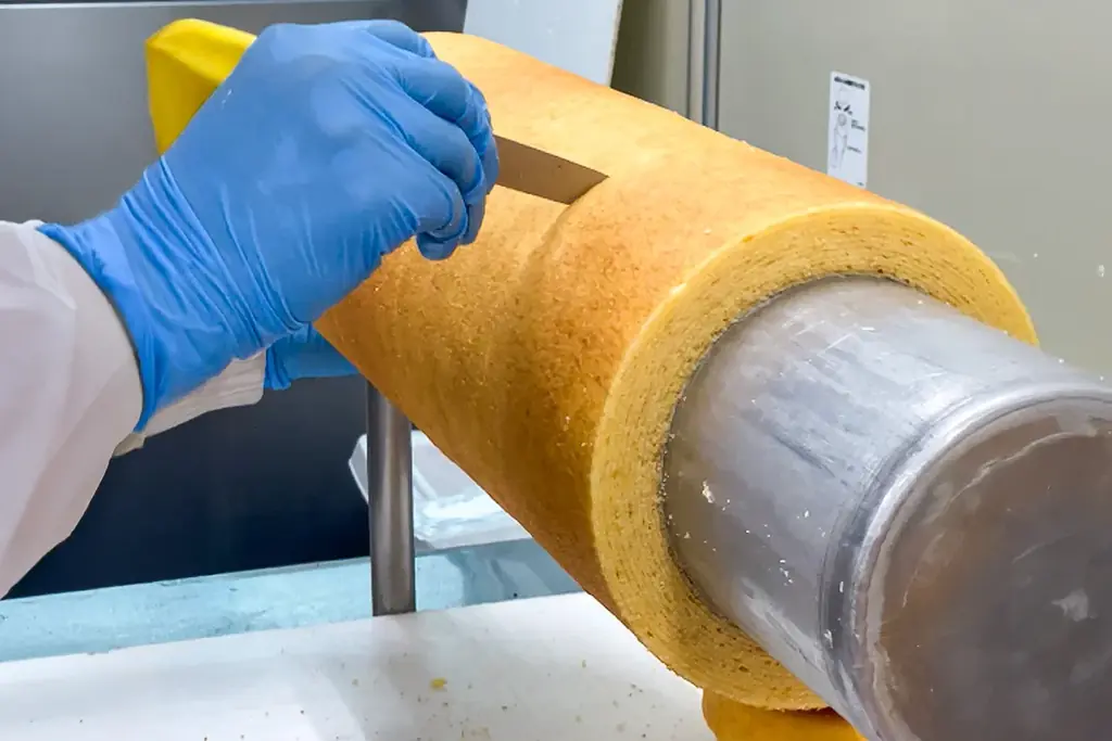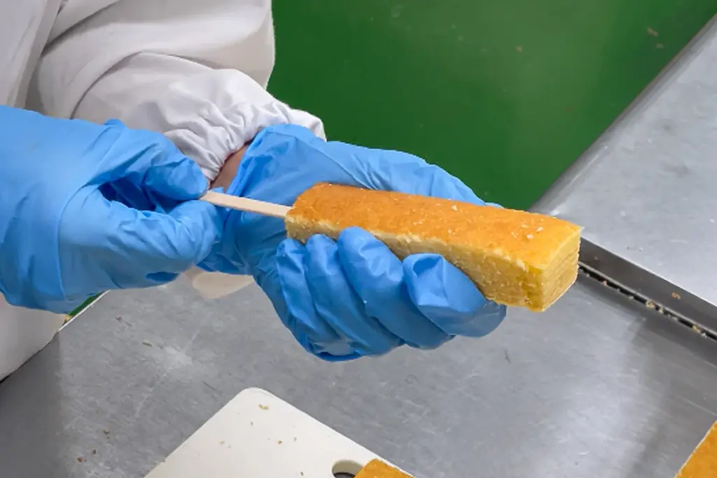 ベースには地元千葉県産の米粉を100%使用しています。米粉の粒子が細かく均一であるため、しっとりともっちりとした食感が生まれ、小麦粉では再現しにくい弾力と上品な甘さを実現しています。職人が丸く焼いたバウムをバーサイズにカットし、一本一本手作業でスティックに刺して仕上げています。