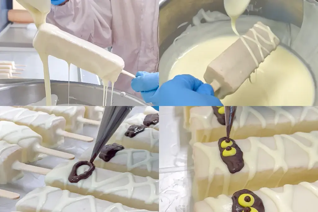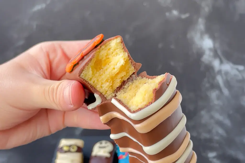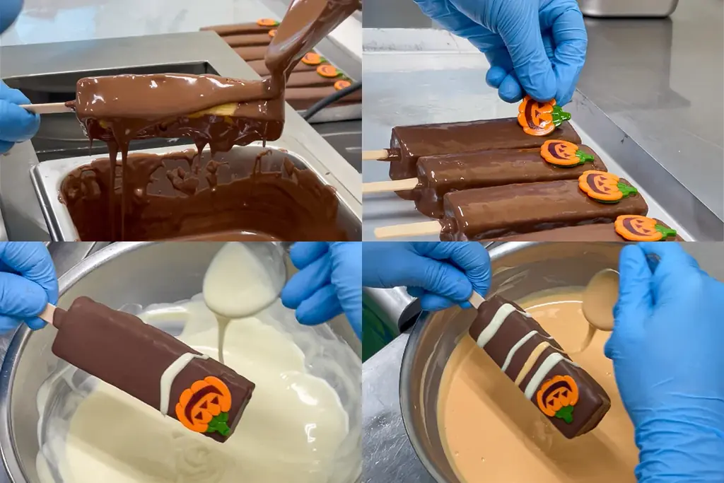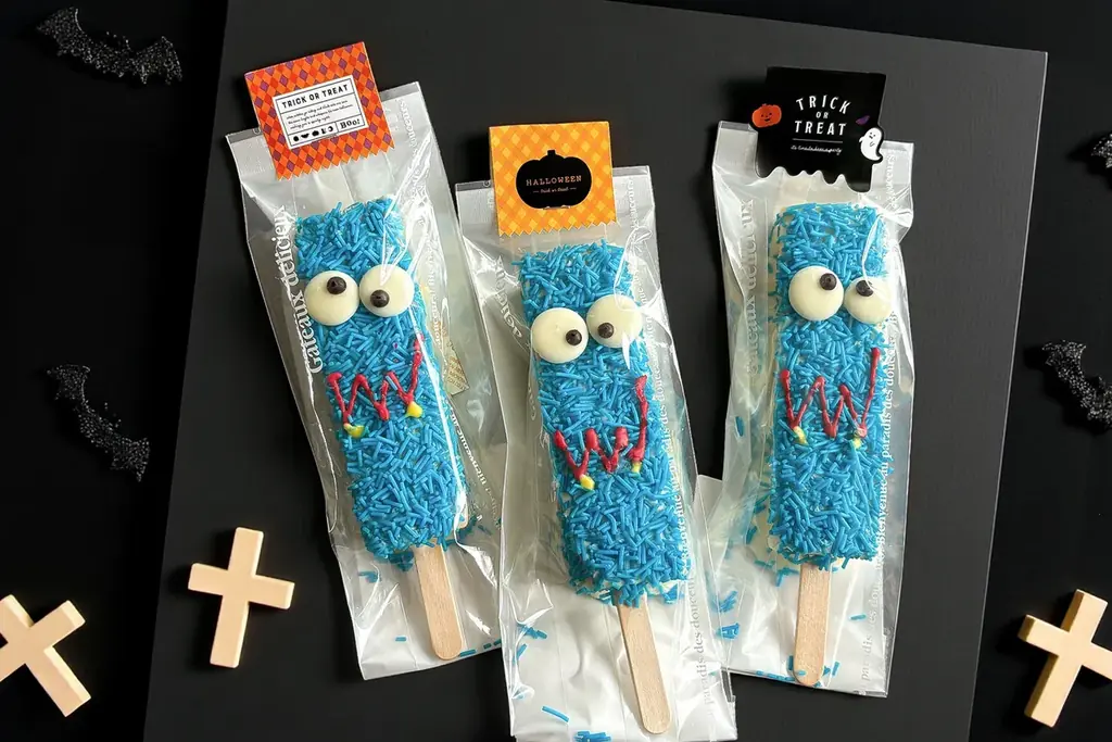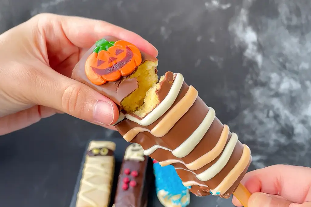 ミルキーなホワイトチョコレートで全体を包み、包帯の立体感まで再現したデザインです。目元はダークチョコ、目玉はホワイトチョコでデコレーションされ、見た目のインパクトとともに甘さを楽しめる一本です。