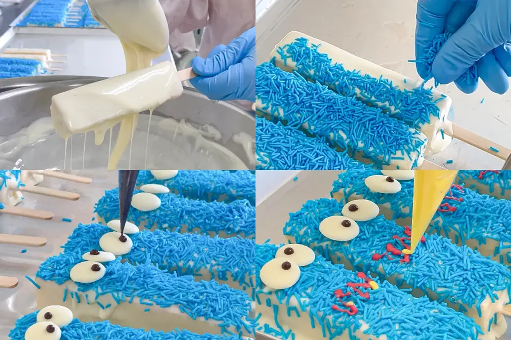 ベースはミルキーなホワイトチョコレートで、鮮やかなブルースプレーを全身に付けています。ザクザクとしたチョコスプレーの食感とミルキーなチョコの調和が子どもに特に人気の組み合わせです。目と口はホワイトチョコとダークチョコのミックスで描かれています。