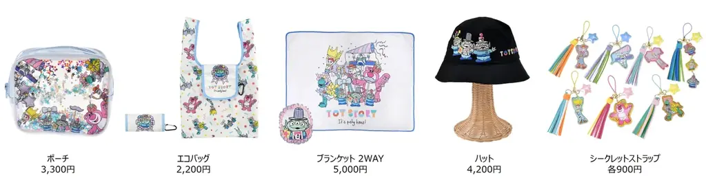 これらに加え、ポーチ類やエコバッグ、クッション兼用のブランケットなどの雑貨類、ハットなどのファッションアイテムが展開されます。シークレットアイテムとしてはタッセル付きストラップ(全7種)が設定されており、対象はウッディ、バズ・ライトイヤー、ボー・ピープ、レックス、エイリアン、ジェシー、ロッツォです。