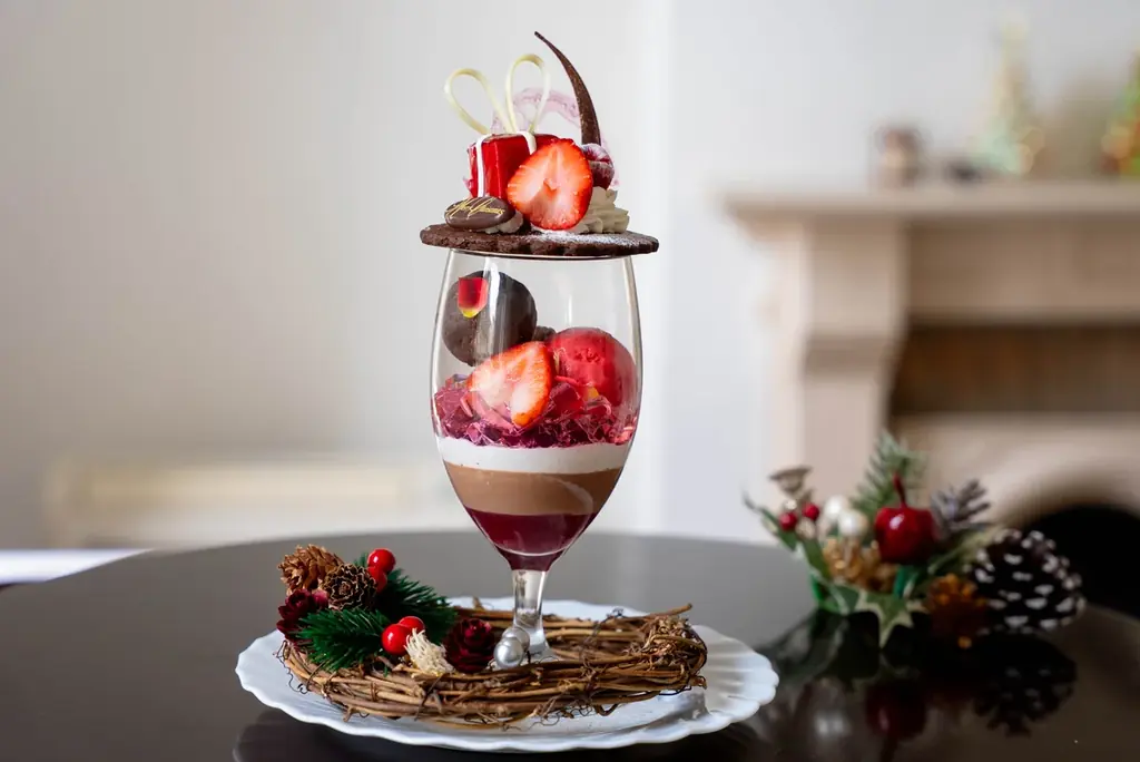 季節限定パフェ「パルフェ・ド・ノエル ~ベリー&ショコラ~」は、グラスの底に香ばしいクランブルとロゼワインのジュレを配し、その上にショコラブランマンジェとベリーを重ねます。ベルギー産チョコレートの濃厚なアイスとフランボワーズソルベの組合せが味の深みを作り、塩味の効いたキャラメルサブレで食感のコントラストを付けています。