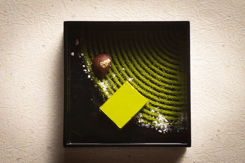 - 「琵琶の白」使用 抹茶薫るガトーオペラ 枯山水仕立て