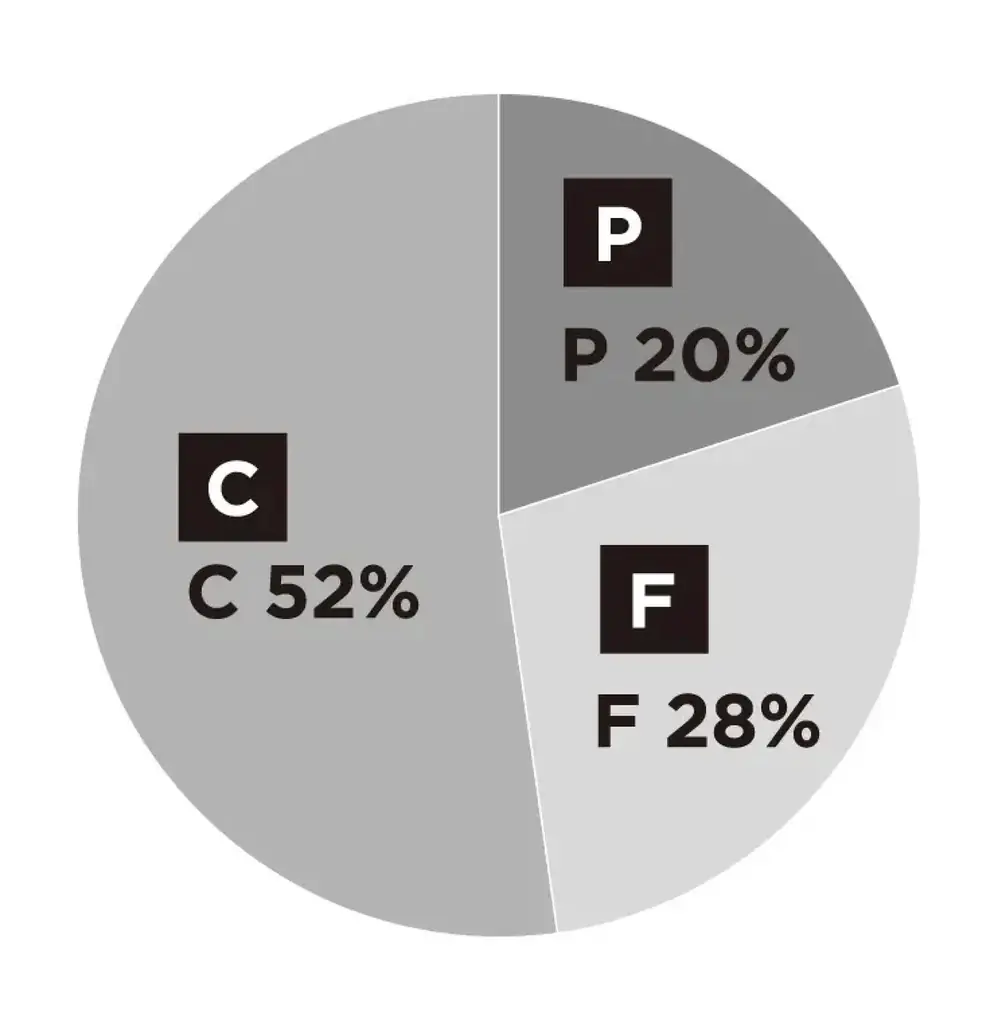 三大栄養素(PFC)のバランスは1食(400kcal)あたりで設計されています。たんぱく質、脂質、炭水化物の配分に加えて、食物繊維やn-3系脂肪酸、ビタミン・ミネラル26種を過不足なく補えるように調整されています。