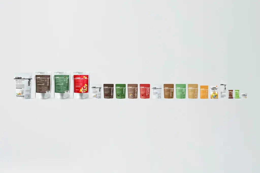 『COMP』は「ヒトのための栄養テクノロジー」を掲げるブランドで、場面ごとに最適な栄養摂取を厳密に設計した製品開発を行っています。トータルバランスドモデル(TB)と糖質調整モデル(LC)の2種類の栄養モデルを基本に、パウダー、グミ、ドリンク、バー、アイス等多様なアプリケーション展開を行っています。