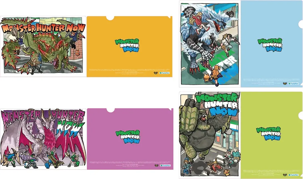 配布される景品はA4クリアファイルとステッカーの二形態で、イラストのモンスターはエスピナス、ガランゴルム、ルナガロン、メル・ゼナの4種が描きおろしで用意されています。