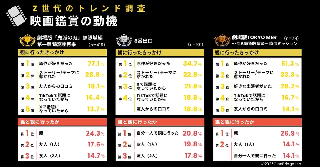 | 友人と一緒に観た割合(例) | 『鬼滅の刃』52.8%、『8番出口』50.4%、『TOKYO MER』33.4% |