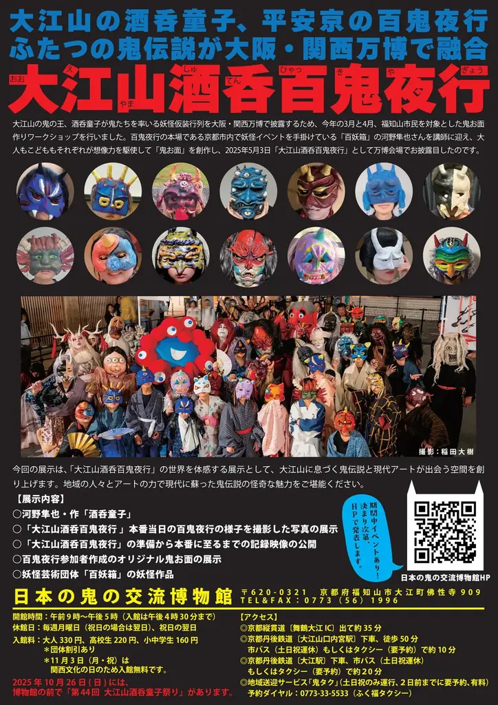 今回の秋季特別展は、万博で生まれた表現の余韻を大江山の地で展示として再編し、地域の鬼文化を国内外へ継続的に発信することを目的としています。企画名は『大江山酒呑百鬼夜行』展。福知山市が掲げる複数の鬼関連企画を総称する『鬼鬼万博(おにおにばんぱく)』のメインイベントに位置づけられます。