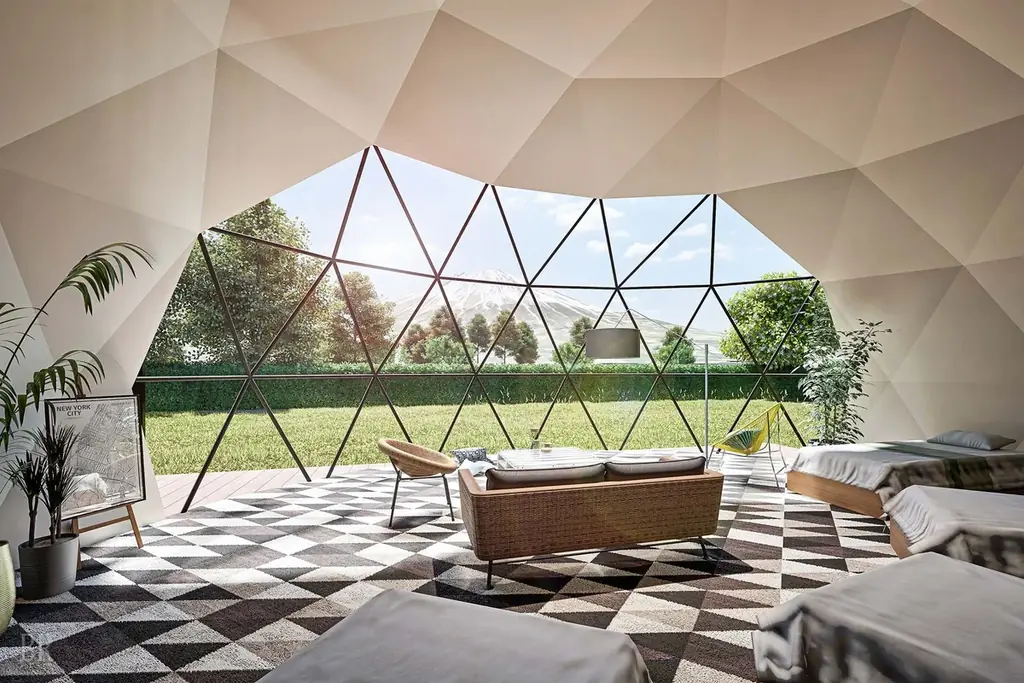 - ツインドームプレミアム:日本初の最大20名宿泊可能なタイプ。2棟の10m大型ドームを連結、富士山形のプールを備え大人数の滞在に最適。