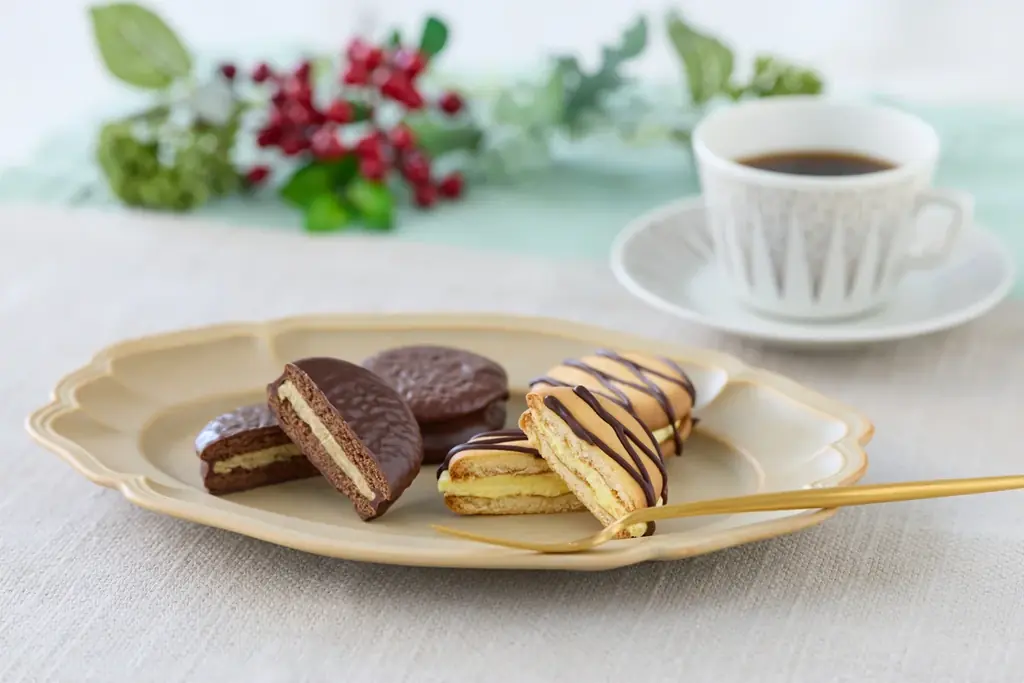 具体的には、焙じ茶パウダーを配合したクリームを、チョコレートを練り込んだ生地でサンド。タルトショコラの香ばしさとチョコのコクが調和するように設計されています。コーヒーとの相性も意識されており、カフェの提供イメージを家庭でも楽しめる味わいです。