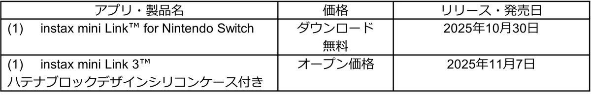 本件に関する注意事項として、Nintendo SwitchおよびNintendo Switch 2に関する表記は任天堂の権利に基づくもので、本文中の「※1 © Nintendo」「Nintendo Switchは任天堂の商標です。」の記載に準じます。また、instax、チェキ、チェキプリント、instax Link、instax mini Link、instax mini Link 3、instax AiR Studio、およびinstax Animationは富士フイルム株式会社の登録商標または商標です。