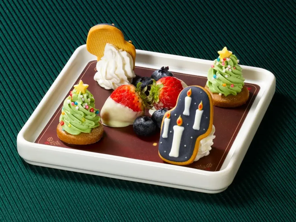 - 上段:大広間のキャンドルクッキー、クリスマスツリータルト(ピスタチオ風味ホイップ、カラーシュガー、星型チョコ)