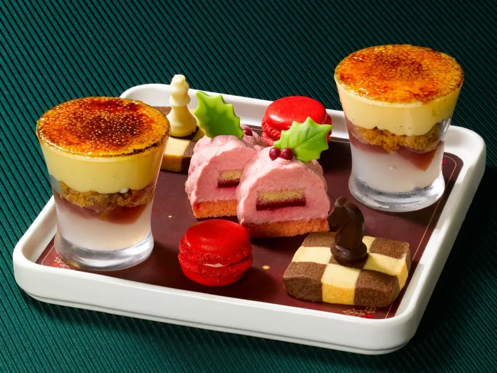 - 中段:アップルコンポートクレームブリュレ(リンゴ風味ゼリー、ジンジャークランブル、キャラメリゼ)、あまおうマカロン、ノエルフランボワーズムースケーキ、チェスクッキー(チェス駒ランダム提供)