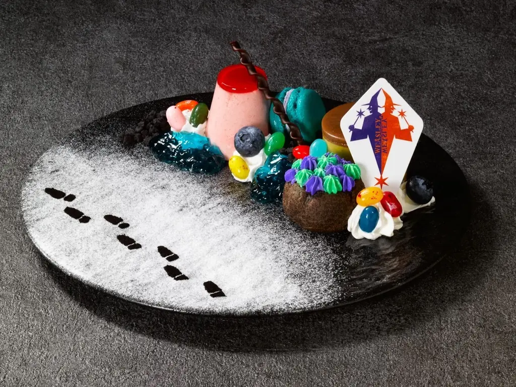 - ダイアゴン横丁デザートプレート:1,800円(税込)— 2種のムースケーキ、シュークリーム、マカロン、ジェリービーンズ、粉糖とブラックココアで足跡デザイン