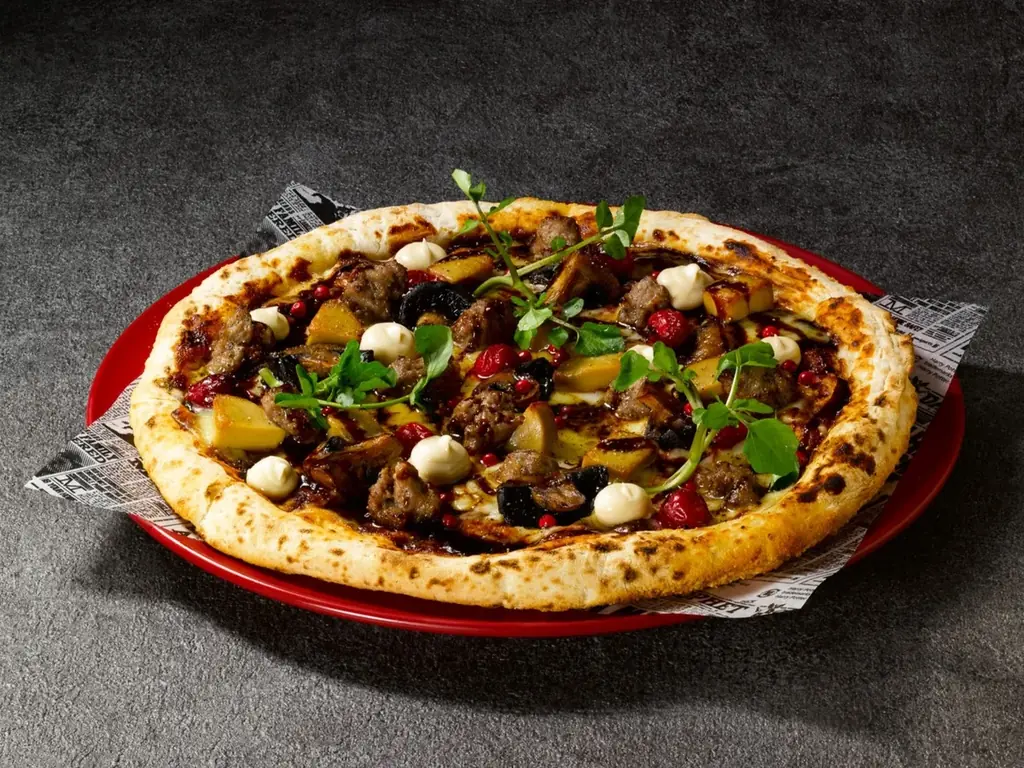 - クリスマスフィーストピザ:2,800円(税込)— 赤ワインソース、チーズ、ビーフパティ、グリルマッシュルーム、クランベリー、バルサミコクリームとトリュフマヨネーズで仕上げ