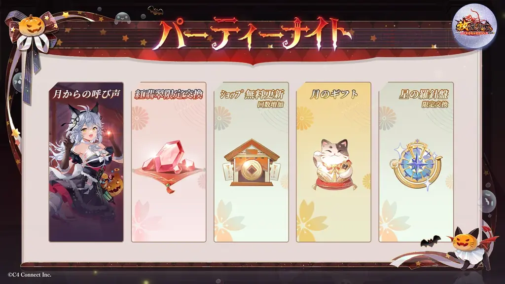 月からの呼び声 期間: 10/21 12:00〜10/30 23:59。7日間ログインで元宝・高速戦闘券・絆の水引等を獲得