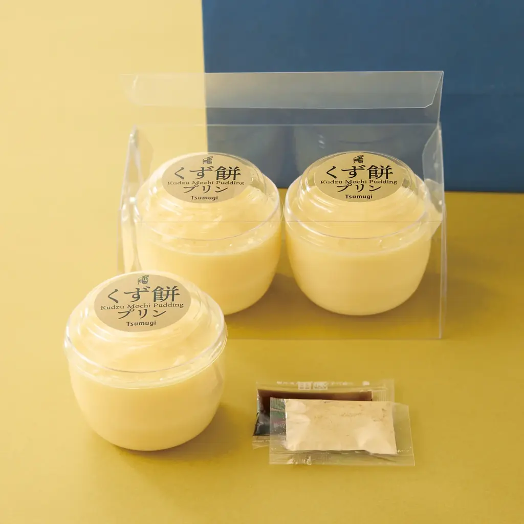 特徴:本葛粉を使用したもっちり食感の和風プリン。黒蜜ときな粉をかけて食べる仕様で、手土産にも適したテイクアウト用が用意されています。