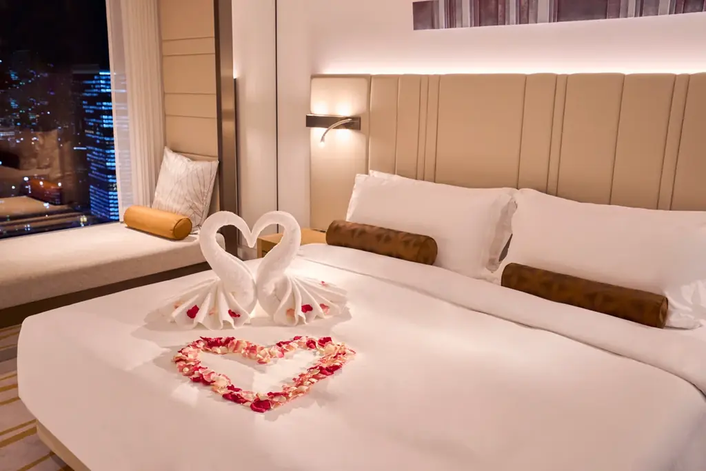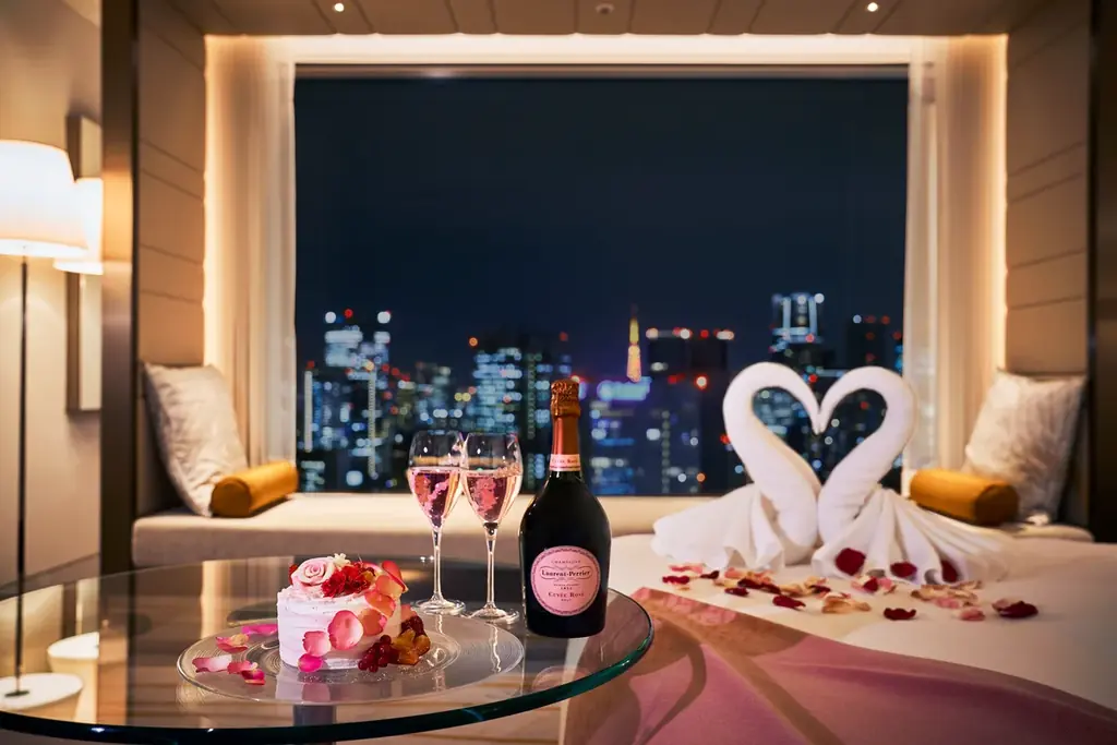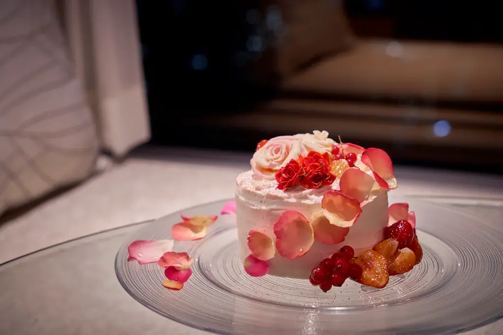 客室演出としてはローズペダルのアートやタオルアートなどを用いて華やかさを添え、部屋で過ごす時間に視覚的な彩りを与える工夫が施されています。プライベートな空間で提供されるケーキとシャンパンを中心に据えた構成です。