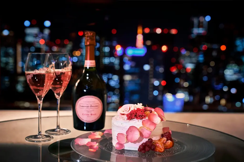 ローラン・ペリエ ロゼはきめ細かな泡立ちと果実の香りが特徴で、ラズベリーやストロベリーの香りを引き立てる相性を意識した組合せです。ケーキはご希望の時間に客室へお届けするサービスが含まれており、静かな夜景と共に味わう設計となっています。