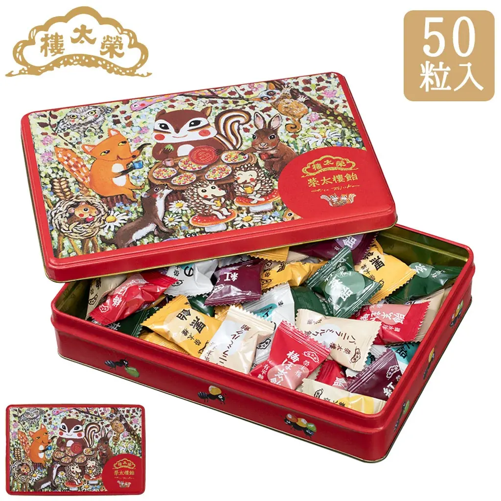 | ちさりすコラボ缶(榮太樓飴50粒) | 価格 3,240円(税込)。藤岡ちさデザイン缶。梅ぼ志飴(黄・紅)各4粒、黒飴10粒、紅茶・抹茶・のど飴・バニラミルク各8粒。 |