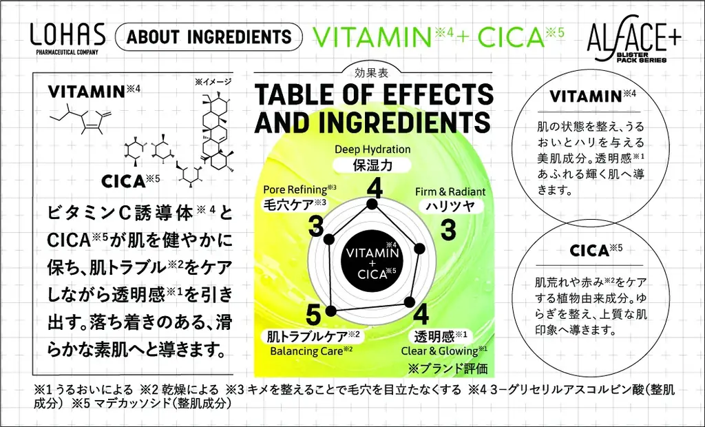 主成分:ビタミンC誘導体※1 × CICA※6。乾燥による肌トラブル※7にアプローチし、健やかで滑らかな肌を目指す設計です。
