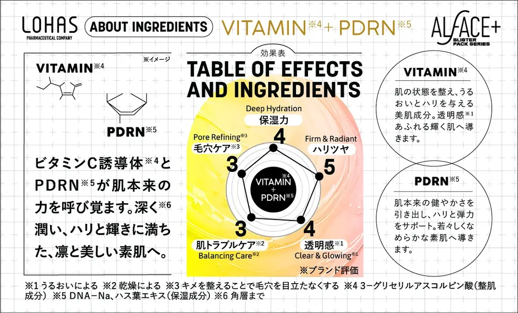 主成分:ビタミンC誘導体※1 × PDRN※2。肌本来の力を呼び覚まし、角層まで深く潤いを与え、ハリと輝きを高める処方です。