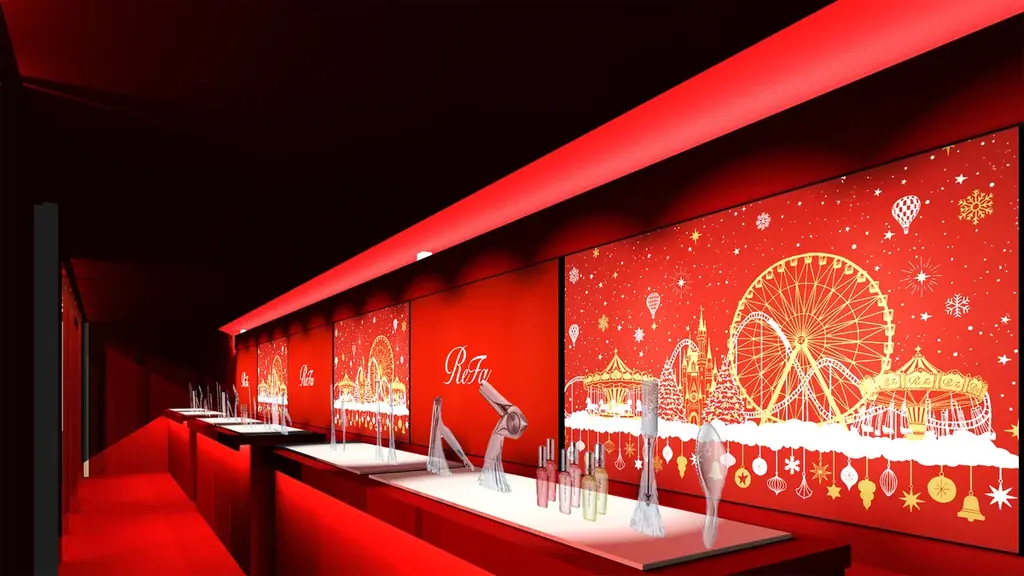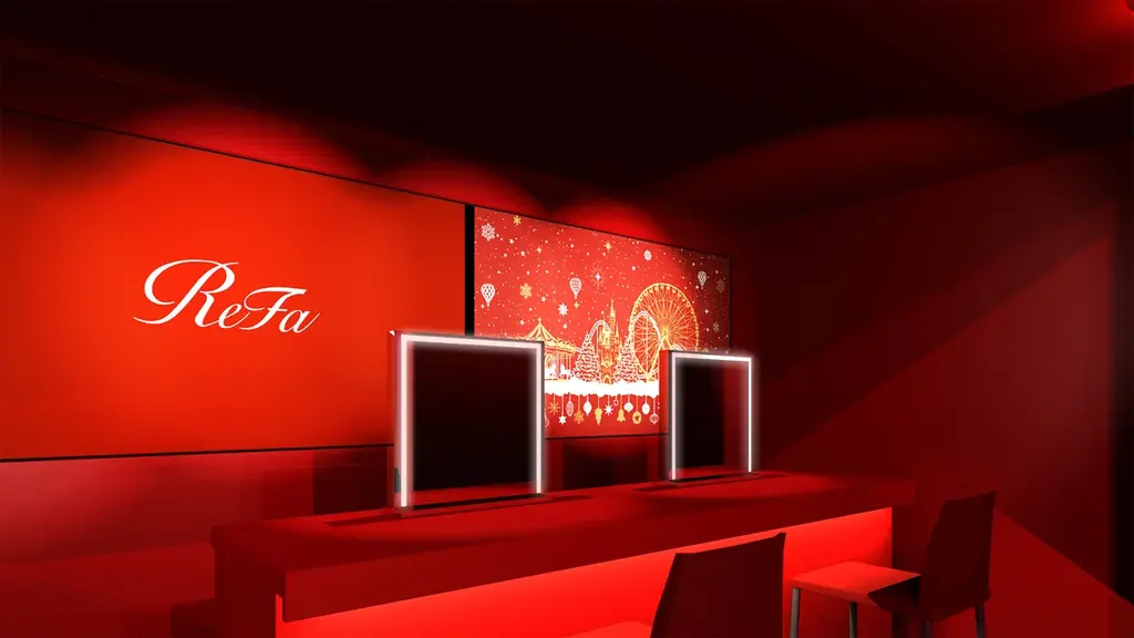 ウィンターキャンペーンに連動するイベント「ReFa WONDERLAND 2025」は、会場を赤を基調とした照明やオブジェで彩り、“WONDERLAND”の世界観を再現します。会場ではヘアスタイリングアドバイスやイルミネーション、フォトスポットなど五感で楽しめるコンテンツを用意しています。
