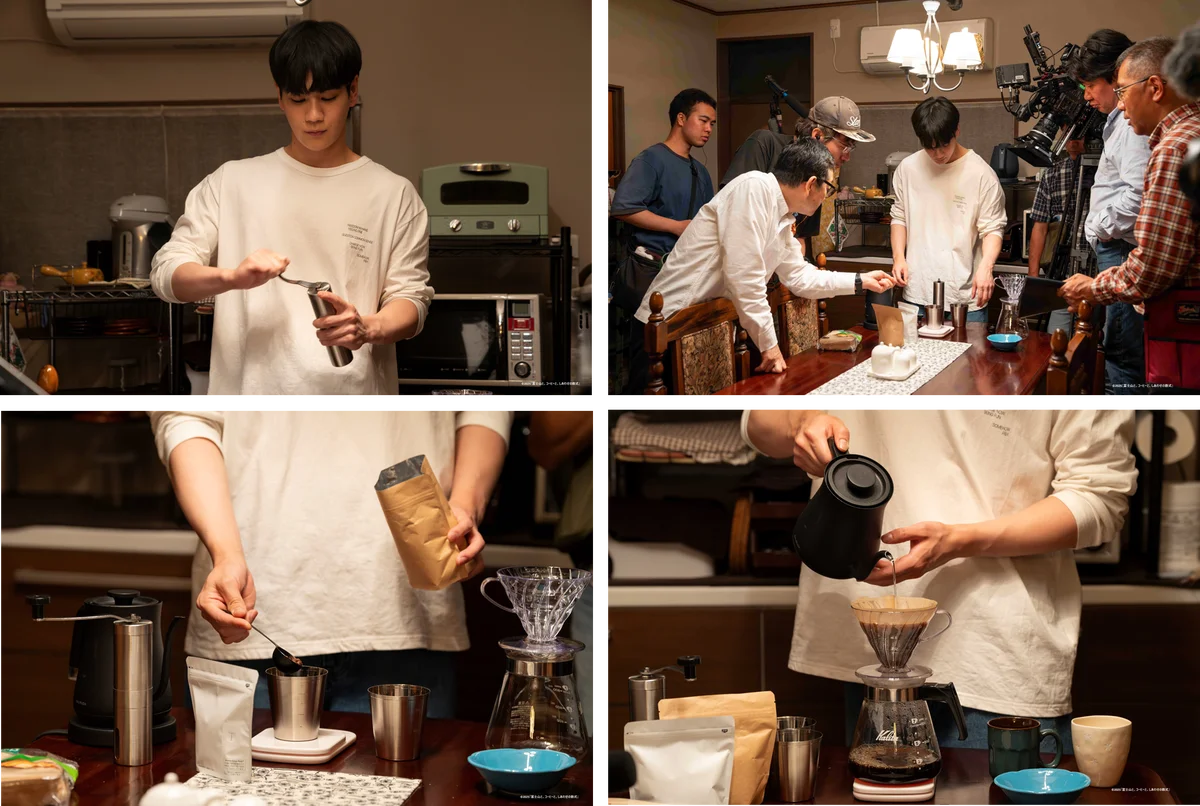 主演の豆原一成さんに対し、豆の挽き方や抽出方法、器具のセッティング、焙煎機の扱い、カメラ映えする所作やセリフの表現まで、実務的に広範囲な技術指導と監修を行いました。
