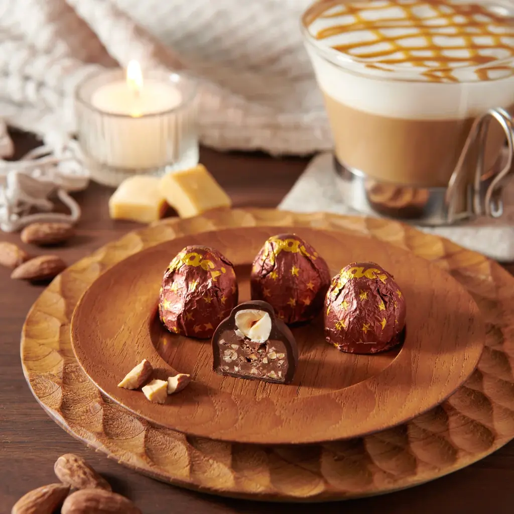 2025年の限定フレーバーは「キャラメルアーモンド」です。キャラメリゼしたアーモンドとヘーゼルナッツを練り込んだジャンデューヤに、丸ごとヘーゼルナッツをのせ、キャラメルの香りが漂うダークチョコでコーティングしたもので、イタリアの伝統菓子であるアーモンド・クロッカンテに着想を得た秋冬向けの贅沢なトリュフです。