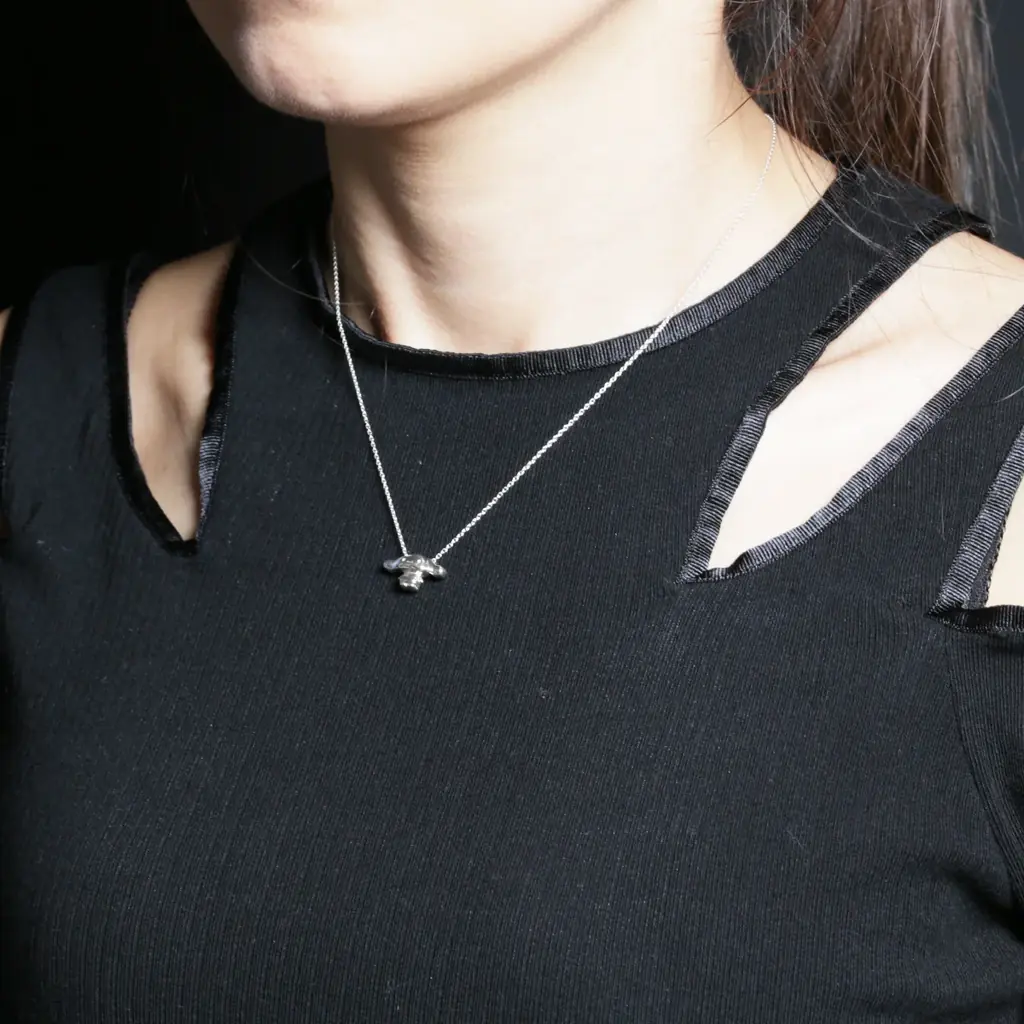 また、ネックレスの背中部分には黒バーが配置され、その内部に四つ葉のクローバーの種を封入した。持ち主が身につけることで、キャラクターの〈守り〉を感じられるお守り的な意匠になっている。シルバー925による3D表現でキャラクター全身を精巧に形作り、外見と内包された意味の両方を併せ持つプロダクトとして設計されている。
