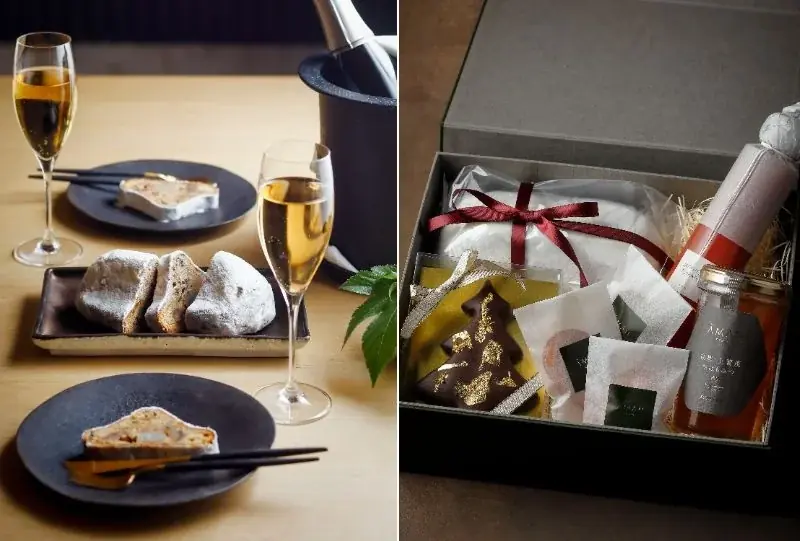 | アマン京都オリジナル クリスマスギフトボックス | 2025年12月1日(月)〜12月25日(木) | 15,000円 | 丹波栗のシュトーレン、クリスマスツリークッキー、フィナンシェ3種、上賀茂生はちみつ、オリジナルジュース | 2025年11月1日(土)より予約開始 | https://www.aman.com/ja-jp/resorts/aman-kyoto/dining/aman-kyoto-christmas-gift-box | 熨斗包装不可。配送は別途料金。ホテル受取は前日18:00までの予約、受取時間11:00〜18:00。配送はお届け指定日の4日前15:00締切。5個以上の注文は希望日の10日前までに要注文。 |