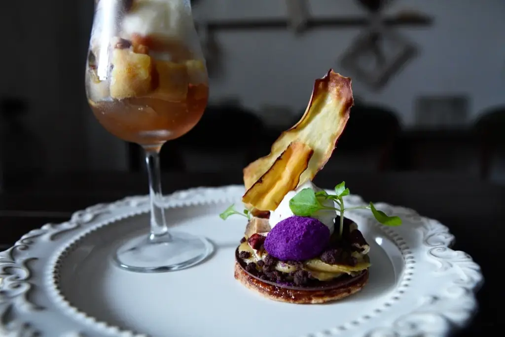 見た目、香り、食感、余韻のすべてに配慮し、畑で感じた風景や香りを一つのグラスに再現することを目指した一品です。トップに配された芋チーズやマイクロハーブ、グラス底部のショコラクランブルで「畑の土」を表現するなど、視覚的にも物語性を持たせています。