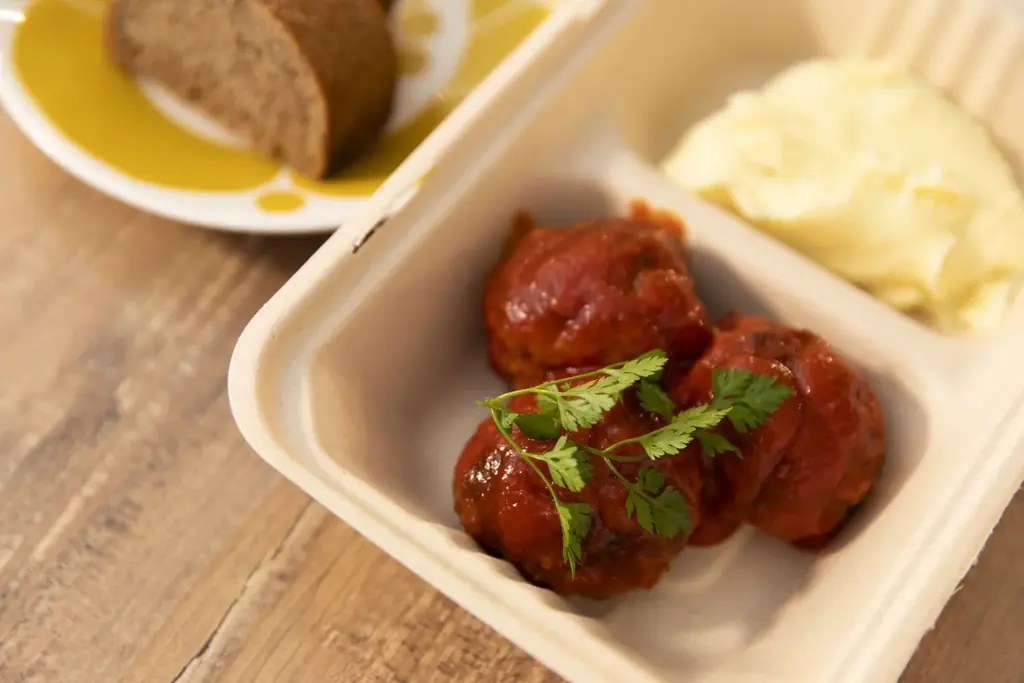 - フィンランドのミートボール料理。今回は大ぶりでハーブ入りのトマトソースが添えられます。