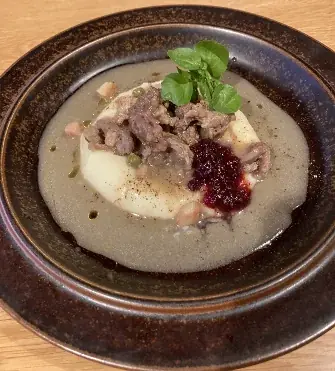 - トナカイ肉の煮込み。骨のだしを使い旨みを引き出し、リンゴンベリージャムで甘酸っぱさを加えます。