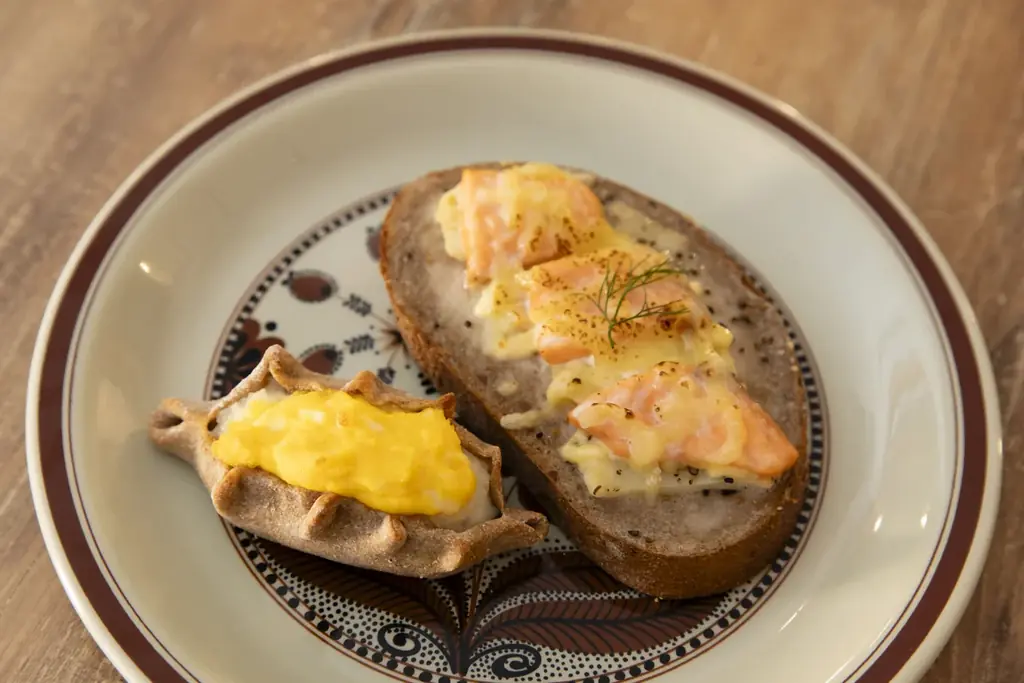 - ミルクがゆをライ麦の生地で包むフィンランドの伝統的なパイ。クラッシュエッグを乗せて提供されます。