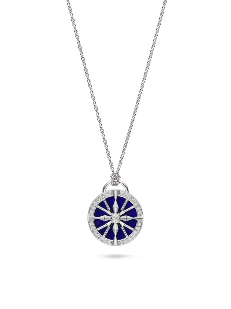 新作ペンダントはラピスラズリを中心に置き、周囲にダイアモンドを配した構成です。メダリオンの放射状の矢は、視覚的に中央石を強調すると同時に、象徴性を高める意匠として機能します。