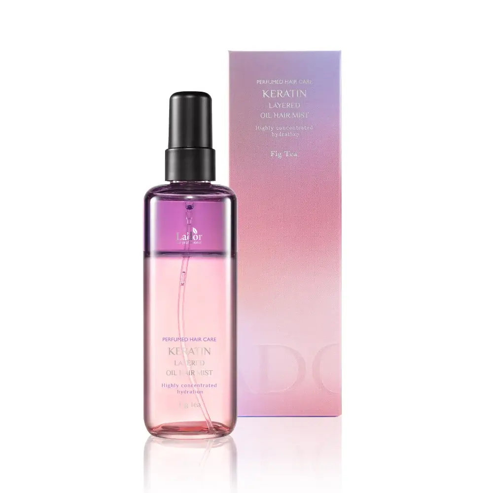 『ケラチンレイヤードミスト』は2層式のヘアミストで、ロフト先行発売の「フィグティの香り」と「オスマンサスの香り」の2種類が用意されています。使用前にシェイクしてオイル層とウォーター層を混ぜることで、髪にうるおいとツヤを与えながらふんわりと香りをまといます。