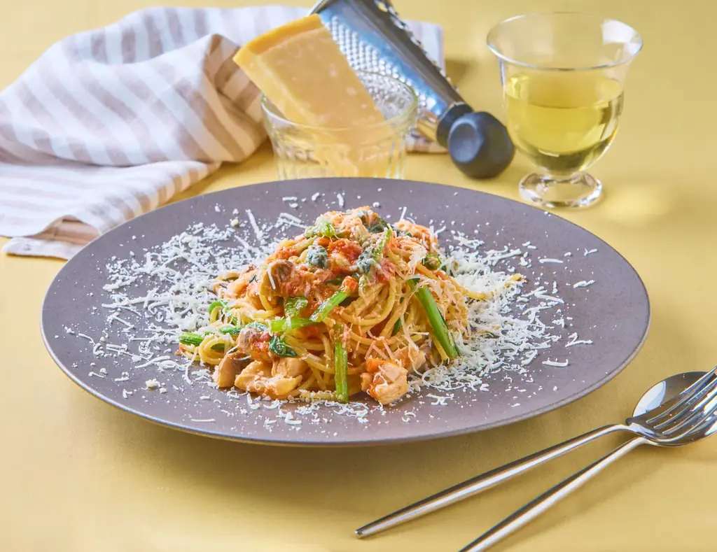 - スパゲッティ 鶏肉、マッシュルーム、ほうれん草パルミジャーノトマトソース
