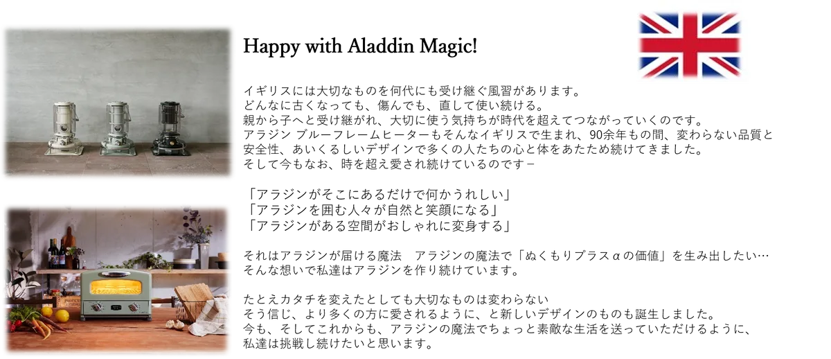 今年は新商品として「アラジン グラファイトオーブンレンジ」および「アラジン グラファイトトースター(1枚焼き)」が展示されるほか、電気ストーブ類、アラジンダイレクトショップ限定商品、公式アンバサダー『Aladdin mate』との共同開発商品など、現行ラインナップと限定アイテムを一堂に確認できます。