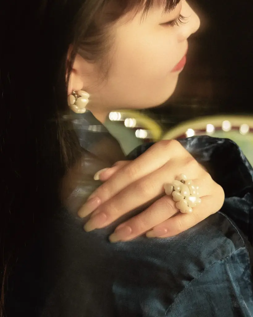 - 薬指リング(ポリエステルレジン、真鍮、パール塗装、メッキ) ¥33,000 ※HOLIDAY COLLECTION limited